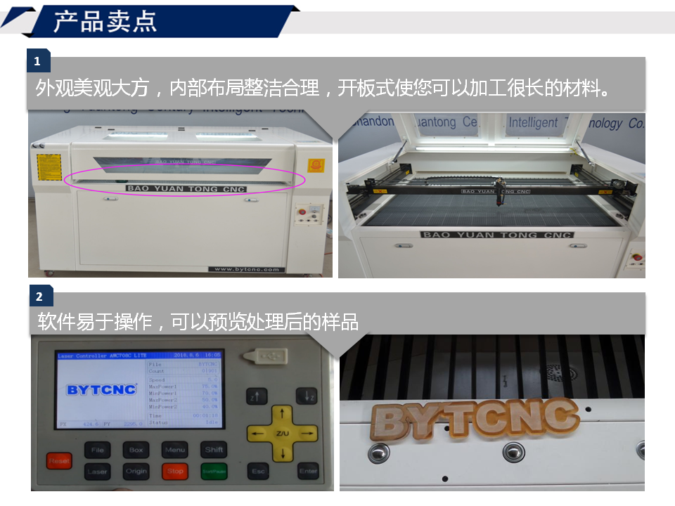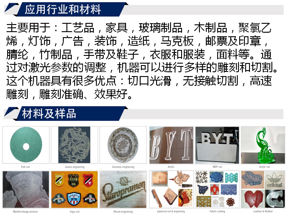 工藝品,家具,玻璃制品,木制品,聚氯乙烯,燈飾,廣告,裝飾,造紙,馬克板,郵票及印章,腈綸,竹制品,手帶及鞋子,衣服和服裝,面料等。通過(guò)對(duì)激光參數(shù)的調(diào)整,機(jī)器可以進(jìn)行多樣的雕刻和切割。這個(gè)機(jī)器具有很多優(yōu)點(diǎn):切口光滑,無(wú)接觸切割,高速雕刻,雕刻準(zhǔn)確、效果好。