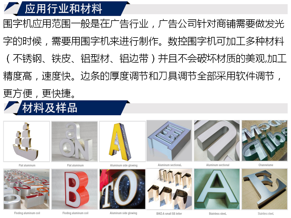 2. 升降式拍打式彎弧器比固定軸單方向拍打上下一致性更強,能做13~16cm的不銹鋼字,其它設(shè)備只能做8~10cm以下的不銹鋼字。