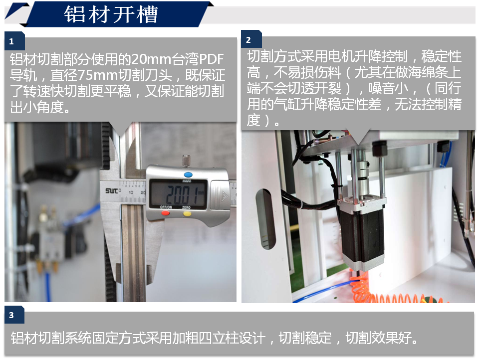 1. 鋁材切割部分使用的20mm臺灣PDF導(dǎo)軌,直徑75mm切割刀頭,既保證了轉(zhuǎn)速快切割更平穩(wěn),又保證能切割出小角度。